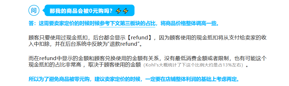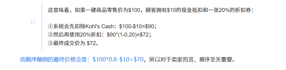 ③卖家红利:简单来说,顾客使用$10的现金抵扣购买你的商品时, $10的成本通常由Kohl’s承担(除非有特殊协议),而卖家获得的是全额销售的佣金基础。