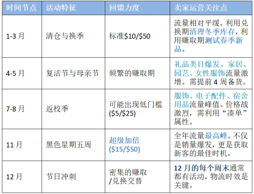 ⚡深度洞察:赚取期流量大、转化高,但客单价需凑单,卖家应主推$10-20的凑单品或$50左右的主力品;兑换期顾客购买力强,卖家应主推高毛利、非必需品或升级型产品。
