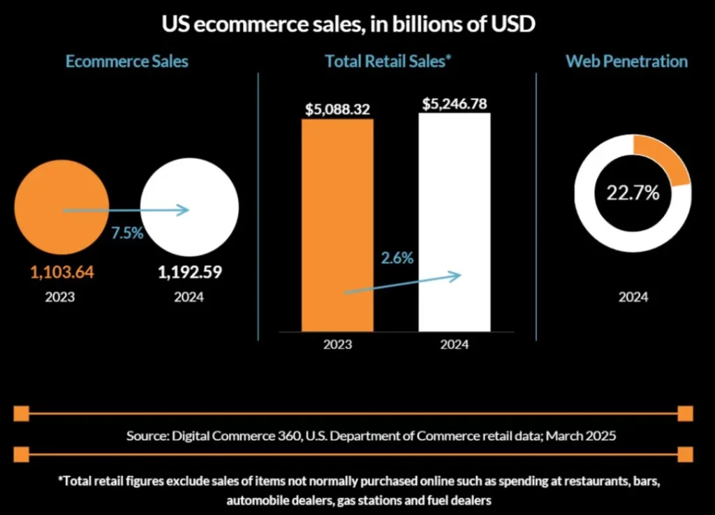 2024年,美国电商渗透率攀升至22.7%,市场规模突破1.2万亿美元,但进入2025年,出海四小龙的大批卖家却深陷“订单下滑”困境。繁荣数据背后,跨境行业正经历一场冰火两重天的变革。接下来,我跟大家聊聊矛盾现象背后的深层原因,一起挖掘出能够帮助卖家逆势增长的“幸存者密码”。