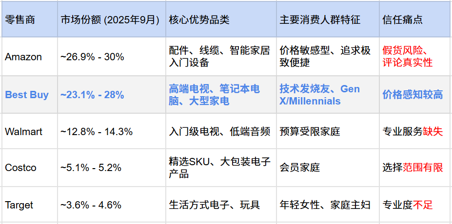 多项市场调研显示,亚马逊在物流速度和日用品购买商占据主导,但在消费电子产品的信任度、专业建议以及正品保障方面,BestBuy依然占据首位。