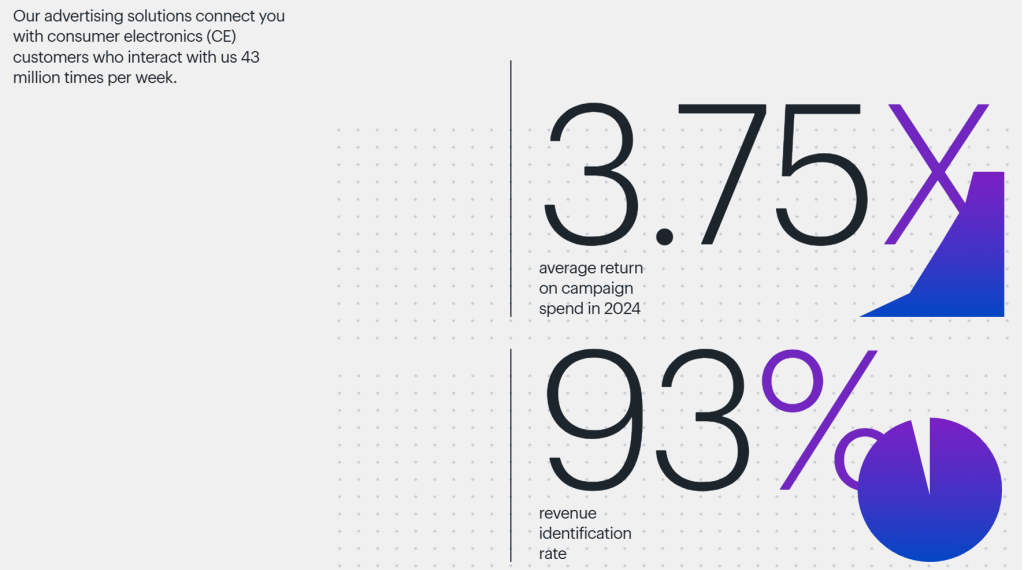 ●ROAS(平均广告支出回报率)表现:由于流量的高意图属性,Best Buy Ads 的效率极高。数据显示,ROAS可达3.75倍,且能有效识别93%的销售归因。这对于营销预算有限的初创品牌来说,意味着每一分钱都花在了刀刃上。