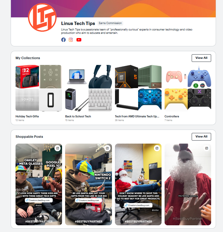这是BestBuy与Linus Tech Tips, UrAvgConsumer, Jenna Ezarik等顶级科技博主深度合作,允许他们建立专属的店面。这些博主不再只是在其YouTube频道下放一个亚马逊链接,而是在BestBuy平台上拥有一个策划选品页。
