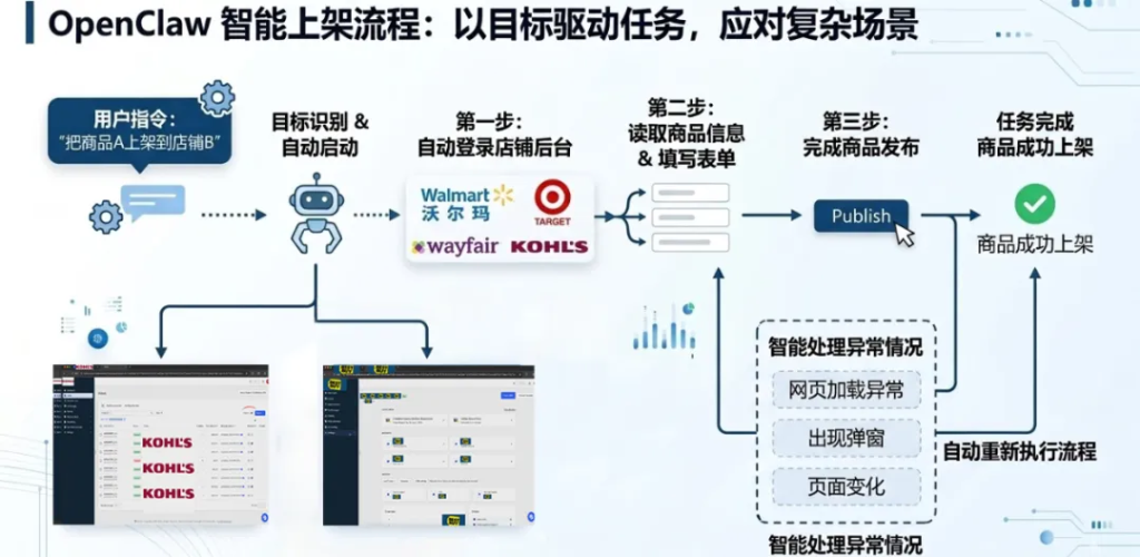 OpenClaw在这个场景中的逻辑其实很简单:它不再依赖固定流程,而是根据目标去完成任务。例如,当你告诉它“把商品A上架到店铺B”,它会自动打开浏览器登录平台,读取商品信息,填写上架表单,并最终完成商品发布。即便过程中遇到网页加载异常、弹窗或者页面变化,它也会尝试重新执行流程。