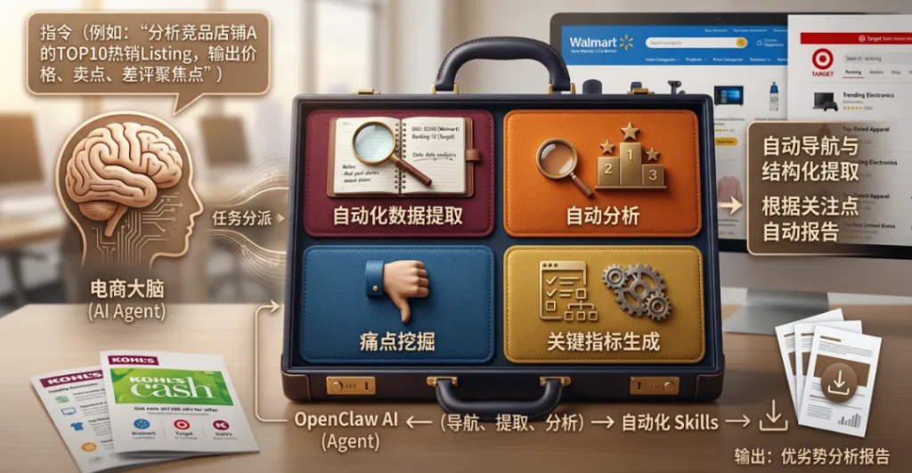 OpenClaw为非技术人员提供一种“白话驱动”的数据采集分析方式。用户只需用自然语言下达指令(如“分析竞品店铺A的TOP10热销Listing,输出价格、卖点、差评聚焦点”),OpenClaw便会自动导航至目标页面,提取结构化数据,并根据预设的关注点(如痛点营销、材质描述)生成优劣势分析报告。