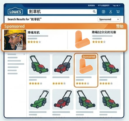 Banner是根据消费者的搜索行为实时生成的。如果买家搜索【割草机(Mowers)】,LMN的算法会调取“赞助商产品”的图片(如3M的耳机)和割草机的分类页背景,实时组合成一个针对你的“原生展示位”。