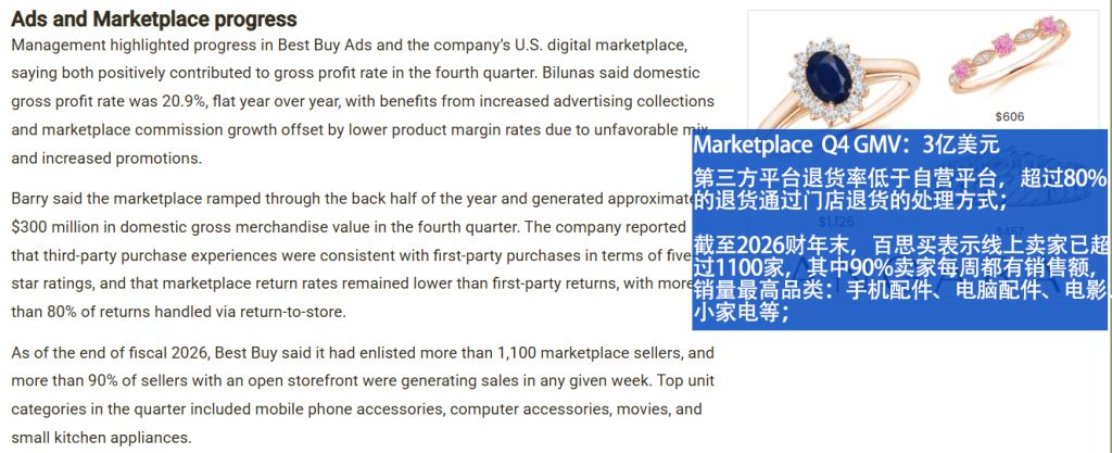百思买在财报电话会议中表示,其第三方市场在该季度产生了约3亿美元的GMV,平台入驻卖家仅1,100家(卖家竞争小)。管理层同时指出,第三方商品购买体验的五星评分与百思买自营商品基本保持一致,这表明平台在卖家质量和用户体验方面已经建立了一定基础。