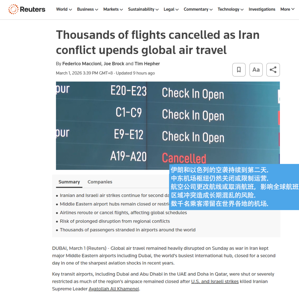 首先是空运。中东地区在全球空运网络中扮演着“中转站”的角色,迪拜、多哈和阿布扎比等枢纽承载了全球约13.6%的货运运力。据Retures报道,这些机场的货运操作现在已受到严重干扰或暂停,导致大量原本应在中东中转的亚洲至欧洲、亚洲至北美的包裹出现严重积压。