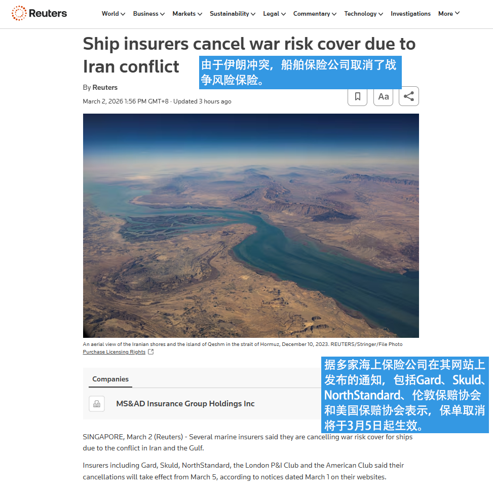 据Reuters报道,多家全球重要的船舶保险提供者,包括Skuld、Gard、NorthStandard、London P&I Club、American Club等,已经宣布撤销该地区的战争风险保险覆盖,并将此类保险排除在这些冲突相关水域之外。