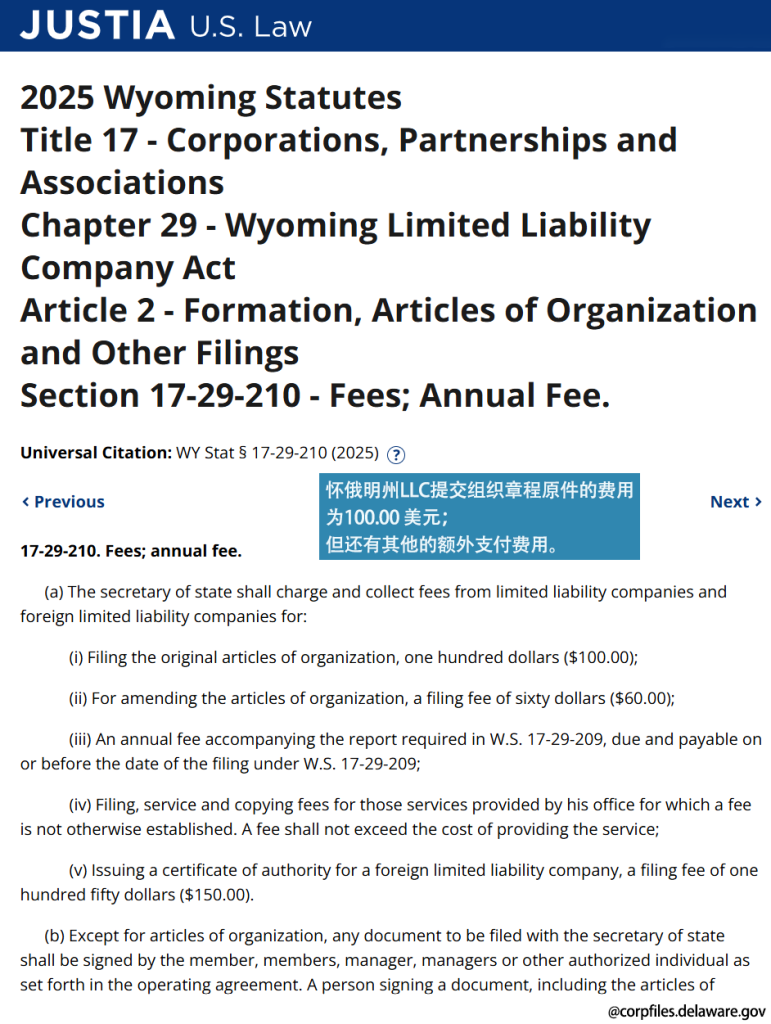 多个州大幅下调官方注册费用。例如特拉华州 LLC 注册费约90美元左右,怀俄明州 LLC 注册费约100美元左右(不含其他附加费用)。