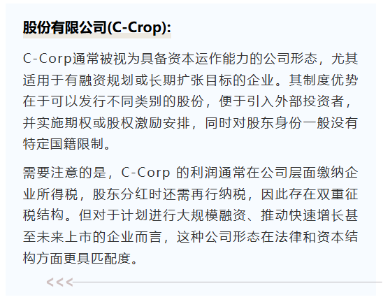 对于大多数出海企业,实体类型很重要,而对于非美籍人士的主要有两种选择:有限责任公司(LLC)和股份有限公司(C-Crop)。