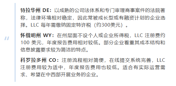 不同州的法律环境和税费政策差异明显,也不是所有州都适合你的公司,以下三个州为例。