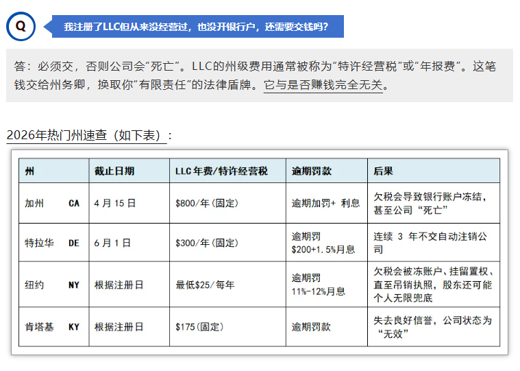 案例背景:一位中国跨境电商卖家,2024年在怀俄明州注册了一家单一成员LLC(外国人持有)。2025 年因店铺被封,公司未产生销售收入。卖家误以为“没有业务就不用处理”,因此在2026年未进行任何州级或联邦层面的申报。
