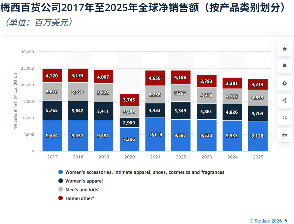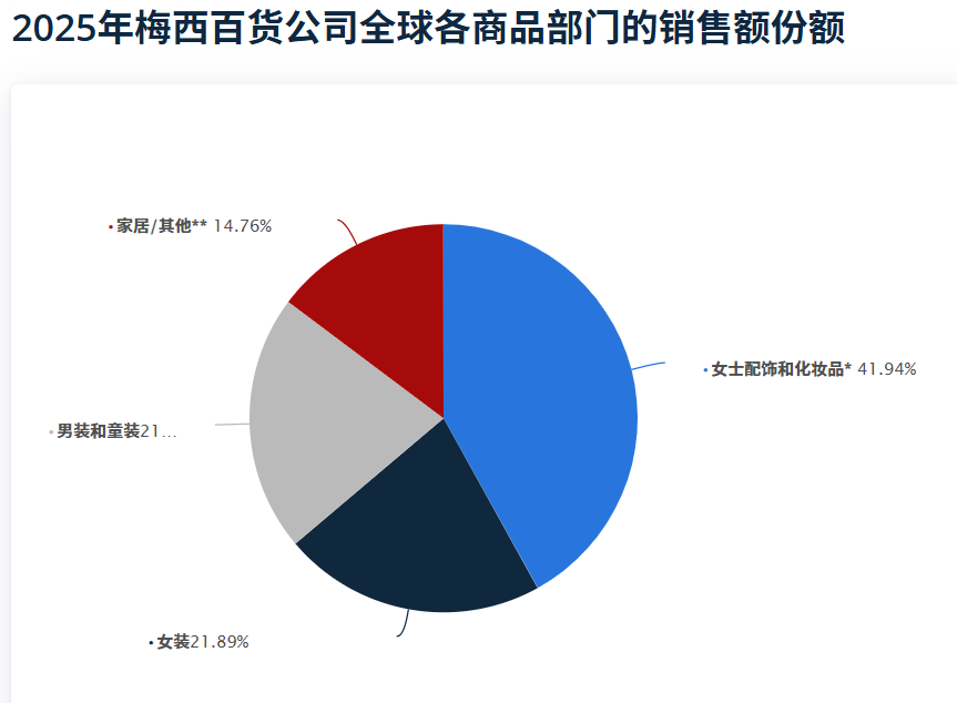据 Statista 数据表显示,梅西百货(Macy’s)目前的营收逻辑已经非常清晰:女性消费是绝对的定海神针,美妆与配饰是增长的动力源。