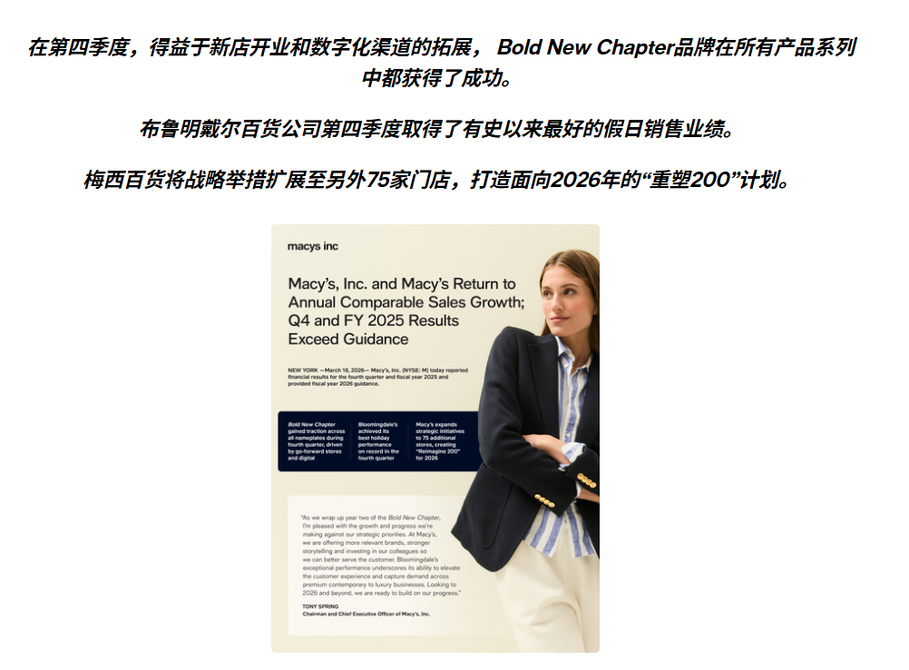 在快时尚和垂直电商的夹击下,百货业似乎正走向黄昏。然而,梅西百货(Macy’s)正通过一场“断臂求生”后的品类大换血打破这种偏见。2025财年,梅西实现了1.5%的年度同店销售正增长,打破了长达三年的沉寂。
