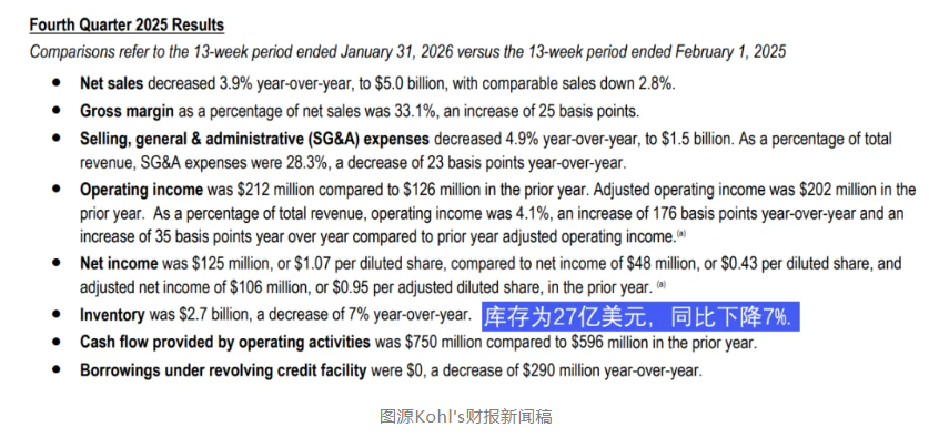 据Kohl’s 2025财年年度报告数据分析,截至2026年1月底,Kohl’s 的库存水平已大幅降至27亿美元,较去年同期骤降7%。这种极致的去库存策略虽然强化了资产负债表,却直接导致了货架的“结构性断档”。