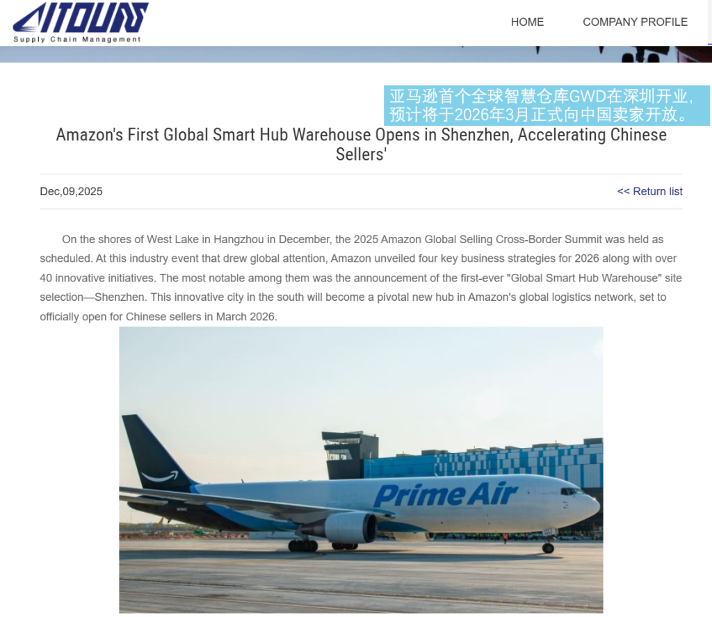 经过数月的试点与内测,亚马逊官方已明确确认:全球首个亚马逊全球智能枢纽仓(GWD)深圳仓将于2026年3月正式向中国卖家全面开放。