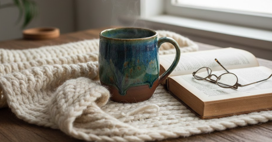 策略一:结合“阿尔卑斯村庄”主题,次要图片可使用温暖的灯光,展示产品在舒适家居环境中的样子。例如,展示反应釉马克杯放在厚实的针织毯上,旁边是一本书,而非仅仅放在桌子上。