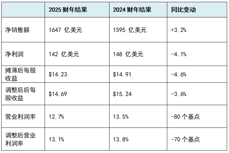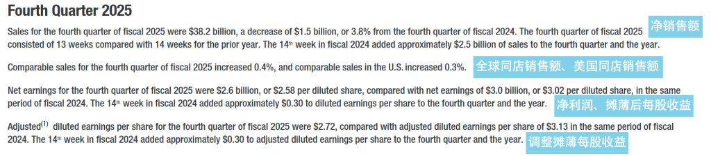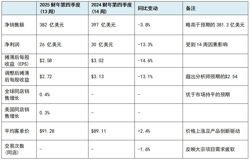 从利润角度看,第四季度净利润为26亿美元,折合摊薄后每股收益2.58美元。若剔除收购相关的无形资产摊销等不可比因素,调整后每股收益为2.72美元,这一表现超过了华尔街分析师普遍预期的2.52至2.54美元。2024财年同期第14周曾为每股收益增加了约0.30美元,因此在同口径下,公司的盈利能力展现出了较强的韧性。