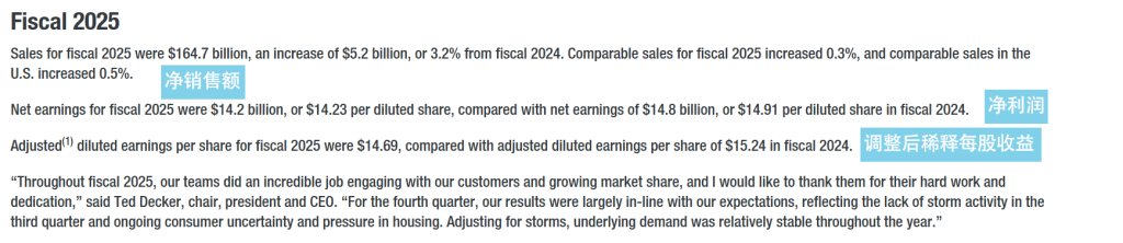 在整个2025财年,家得宝实现总销售额1647亿美元,同比增长3.2%。这一增长主要得益于对专业分销业务(如SRS和GMS)的收购并表。全年同店销售额增长0.3%,其中美国市场增长0.5%。全年的营业利润率为12.7%,调整后为13.1% 。利润率的下滑主要源于运营费用的自然去杠杆作用,以及为支持更快的交付速度而增加的库存和物流投入。