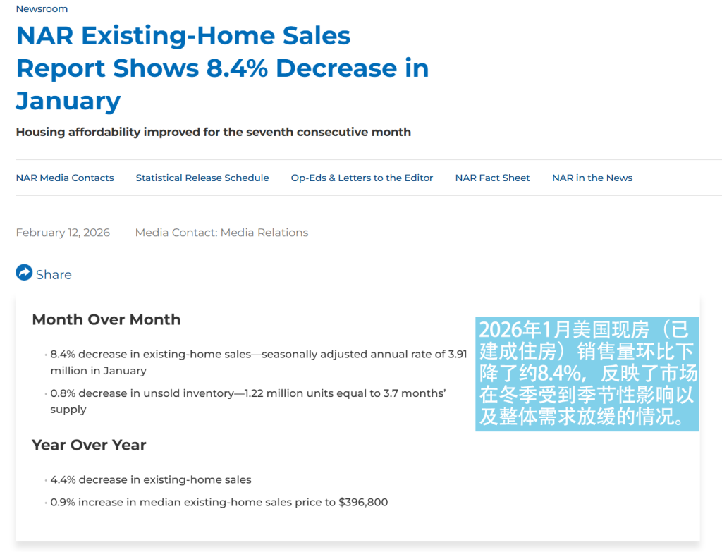 截至2026年2月中旬,美国30年期固定房贷利率平均为6.01%,对于大部分持有疫情期间3%左右低利率贷款的家庭来说,目前的利率水平依然具有抑制性,使得房主普遍不愿出售现有房产并购买新房,进而导致住房周转率大幅下降。