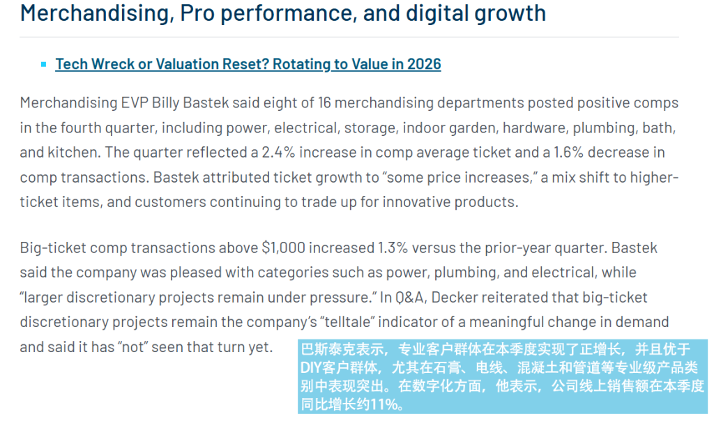 公司财报显示,2026财年第四季度,通过家得宝数字化平台(包括网站与移动端)完成的线上可比销售额同比增长约11%,彰显出数字渠道在整体销售中的增长动力。管理层也提到,本季度持续改进了数字化履约和交付体验(例如为大件商品引入更可靠的实时配送跟踪功能),以提升客户线上购物的便利性和服务质量。