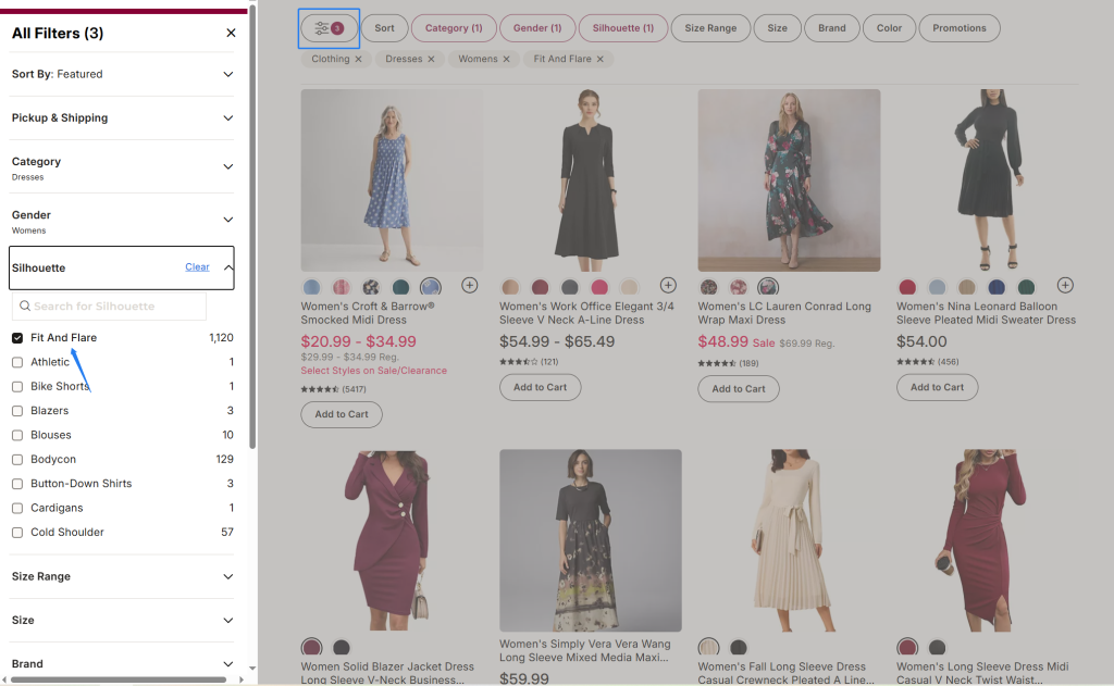 Kohl’s前台页面极其依赖左侧导航栏的过滤器。比如在女装类目中,如果卖家没有在后台将裙子的“Silhouette”属性映射为“Fit and Flare”,那么当用户点击该过滤器时(该选项下有1122个商品 ),卖家的商品就会直接消失。