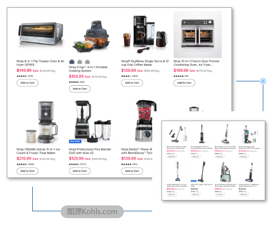 ①现状:Ninja和Shark几乎占据统治地位。Ninja热门单品包括冰淇淋机、便携式烹饪系统、空气炸锅,消费者们倾向于购买定价$150-300的产品,因为一次购买就可以获得$30-$60的Kohl’s Cash。Shark热门单品包括无线吸尘器、扫地机器人。