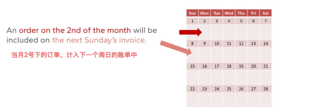 示例:4月2日订单→4月5日(周日)包含在发票中→4月6-10日期间付款