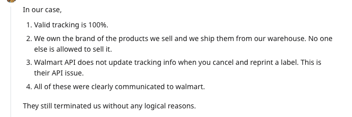 沃尔玛也是在每年的年底年初会有大规模扫号,而且扫号就很容易出现误伤,每年在沃尔玛的美国社群里也会发现很多被扫掉的本土卖家。
